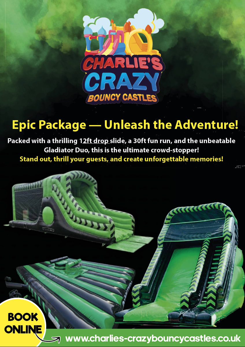 Don’t miss out on making your event truly unforgettable. The Epic Package is in high demand, so secure your date now! For bookings and more information, contact CHARLIES CRAZY BOUNCY CASTLES at 07535686284 or email info@charlies-crazybouncycastles.co.uk. Let’s make your next event EPIC! π