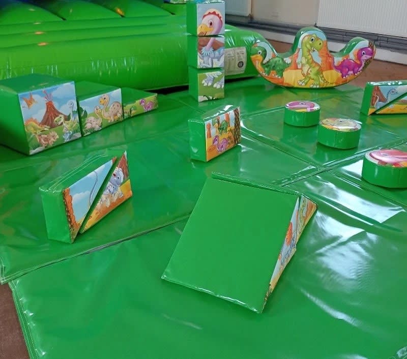 Includes a full range of soft play shapes, a dinosaur double rocker, and safety mats for added protection.