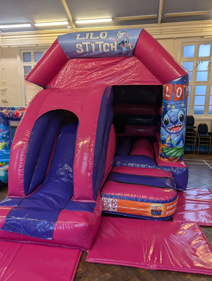 Make your party extra special with our Pink & Purple Stitch & Lilo Slide Combi Bouncy Castle.