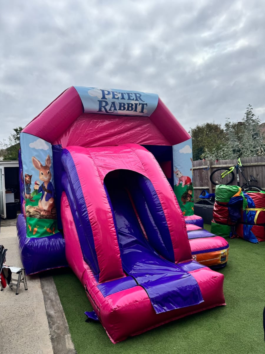Great if you’re searching for Peter Rabbit bouncy castle hire, toddler-friendly slide combi, pink & purple bouncy castle, or children’s party inflatable near me.