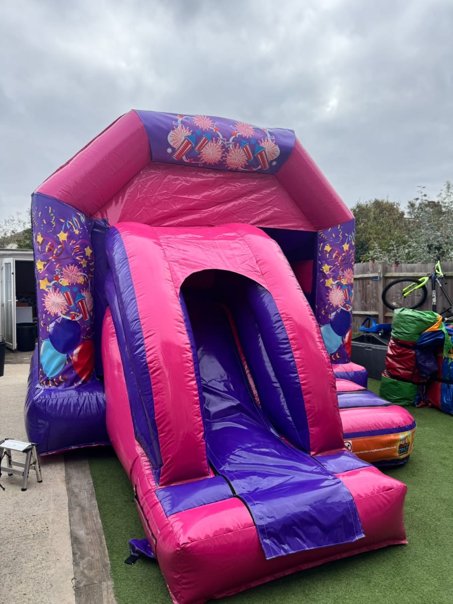 The Pink & Purple Celebration Slide Combi is one of our most flexible and frequently booked inflatables, especially when customers want something that fits any party theme.