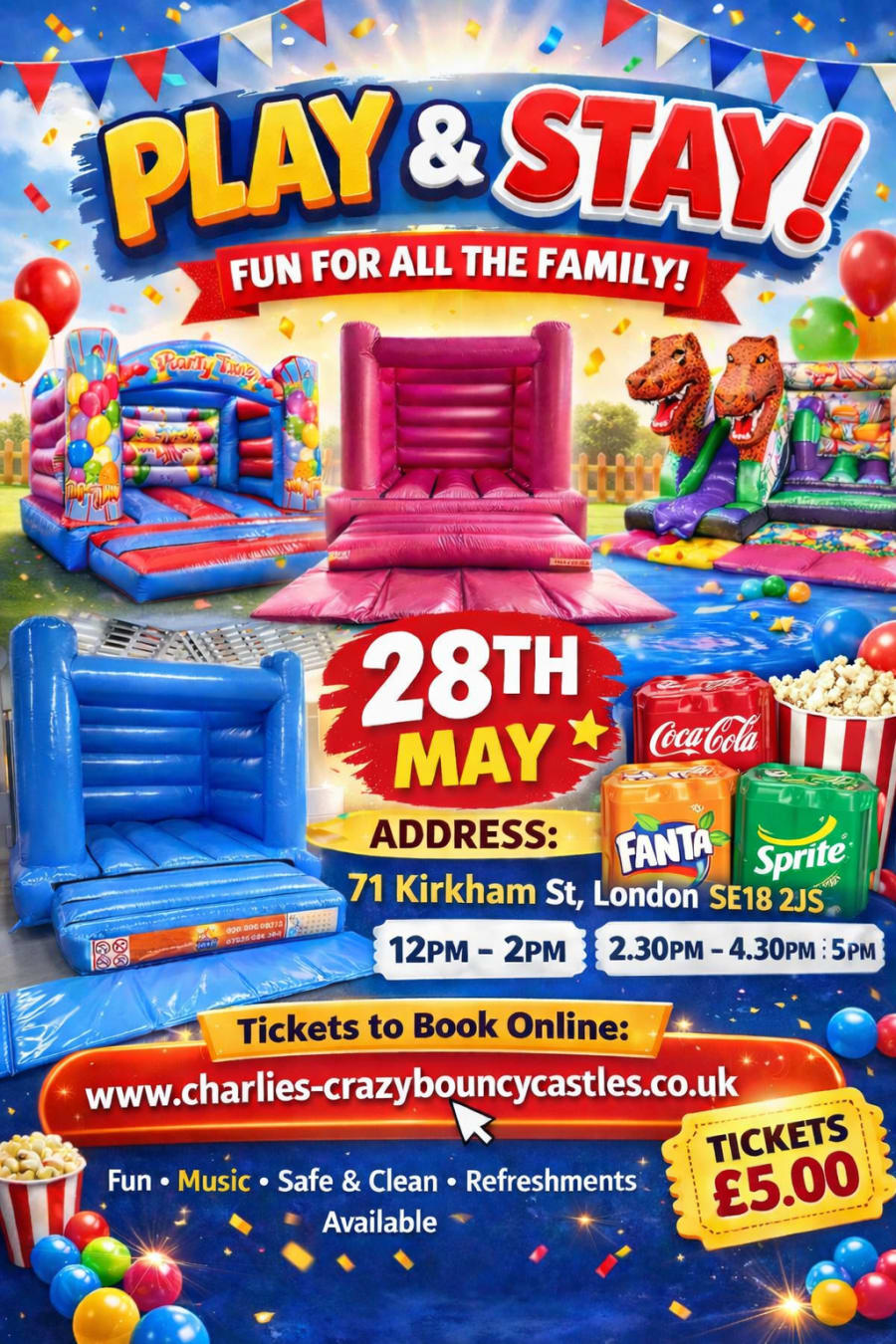 Our Play & Stay Event on 28th May is packed with colour, energy, inflatables and non-stop fun for the kids – all in a safe, indoor venue right here in SE18.